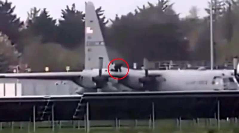 Кадри, разпространяващи се в социалните медии, показват човек, който се катери на транспортен самолет C-130 Hercules на американските военновъздушни сили, паркиран на отдалечена пътека за рулиране.